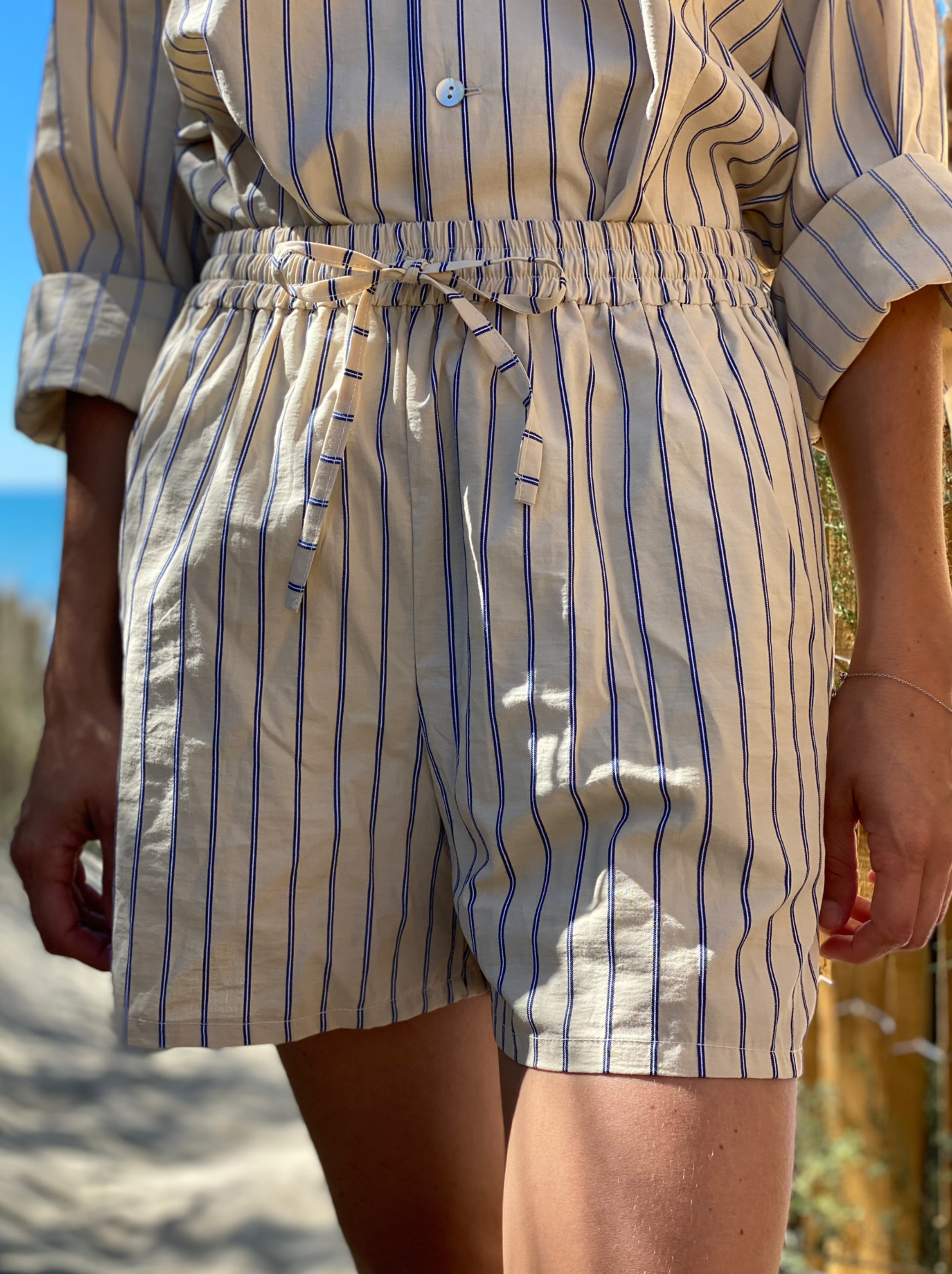 Ensemble costume short taille haute et veste oversize bleus à rayures blanches. Fabriqué en France. Créations limitées. Mode éthique et responsable.